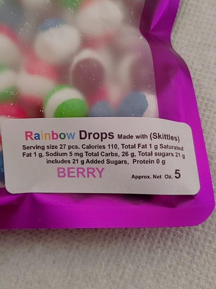 Get pleasure from 5 oz. of Freeze Dried Berry Flavored RAINBOW DROPS.. contains berry punch, strawberry, melon berry, wild cherry, and raspberry flavors Chew-size, colourful chewy candies Inventory the workplace pantry with the daring fruity taste. Excellent for events, game-time snacks, and even as a topping to your favourite dessert. A crunchy delight. Very good assortment of flavors, Freeze drying convey out the extreme flavors, for a crunchy pleasant snack.. Some settling of contents could happen throughout delivery, In that case, Use the mud to dip suckers in, or as a topping for Ice cream or Yogurt. Introducing Freeze Dried Rainbow Drops, a pleasant deal with that takes the enduring flavors to an entire new stage! These delicious goodies are vital for sweet lovers looking for a singular and thrilling style expertise. Our Freeze Dried Rainbow Drops are fastidiously crafted in our sweetshop utilizing solely the best candies. Every bag is crammed with an explosion of vibrant colours and irresistible flavors which are positive to fulfill even probably the most discerning candy tooth. The product picture showcases the true essence of those magical treats. A visually interesting bag, labeled “Rainbow Drops,” immediately captures consideration and guarantees a style journey like no different. Resting contained in the bag, mouthwatering candies in several colours and sizes function a sneak peek into the flavor-packed wonders that await you. However what units Freeze Dried Rainbow Drops aside? By way of a meticulous freeze-drying course of, we’ve got remodeled these already scrumptious candies into a singular texture that’s each crispy and melt-in-your-mouth. This modern method retains the unbelievable fruity flavors whereas enhancing the irresistible crunch, making every chunk an absolute delight. Whether or not you are trying to fulfill your cravings or want a pleasant present for somebody particular,
