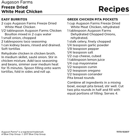 The Augason Farms Freeze Dried Rooster Breast Chunks 16 oz Quantity 10 Can are a fast and scrumptious approach so as to add hen to any dish. Naturally low in fats, you merely rehydrate these pre-cooked chunks of actual poultry after which use them as you’ll prepare dinner hen. These tasty morsels will be added to pastas, stir fry, casseroles, salads, sandwich mixes, enchiladas and quite a lot of different recipes. That is an all pure product that consists of 15 Servings and a couple of, 100 Energy, with a shelf-life of as much as 25 years. All this comfort makes it excellent for Meals Storage, Emergencies, Survival, Tenting, and On a regular basis Use! Make the smart determination and let Augason Farms provide you with a peace of thoughts that is as indispensable as it’s scrumptious. Household owned and operated since 1972, Augason Farms believes that nice style is a practice price preserving. They’re going to give you scrumptious peace of thoughts with their meals necessities. Please discard oxygen absorber after opening. Finest when saved in a cool dry place at temperatures between 55 Diploma and 70 Diploma F (best humidity 15%).