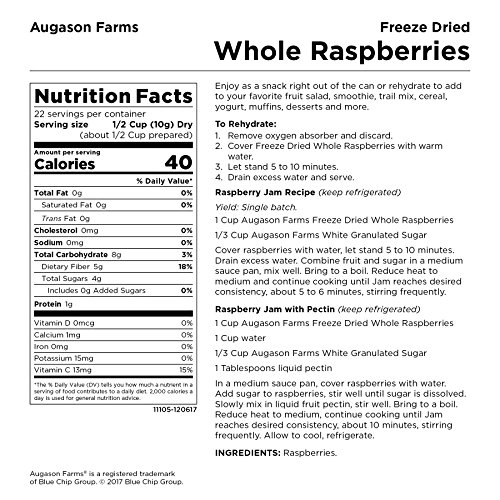 The Augason Farms Freeze Dried Entire Raspberries 8 oz #10 Can are a wholesome and scrumptious snack, wealthy in Vitamin C. They improve any recipe with tart, full-bodied raspberry taste. Rehydrate them to be used on breakfast cereal, in deserts and fruit dishes. Naturally, they lend themselves to on a regular basis use in addition to long run storage. this can be a Licensed Gluten Free and an all pure product that consists of twenty-two Servings and 880 Energy, with a shelf-life of as much as 30 years. All this comfort makes it excellent for Meals Storage, Emergencies, Survival, Tenting, and On a regular basis Use! For over 40 years we now have refined our recipes and sourced the best elements to create the best high quality, long-term freeze dried and dehydrated meal options available in the market. Whereas most emergency meals storage corporations contract their manufacturing to outdoors producers, we produce and bundle all our meals from starting to finish. Meaning we will promise the very best quality and worth available in the market. Make the clever resolution and let Augason Farms provide you with a peace of thoughts that is as important as it’s scrumptious. Please discard oxygen absorber after opening. Greatest when saved in a cool dry place at temperatures between 55 and 70 Levels F (ideally suited humidity 15%).