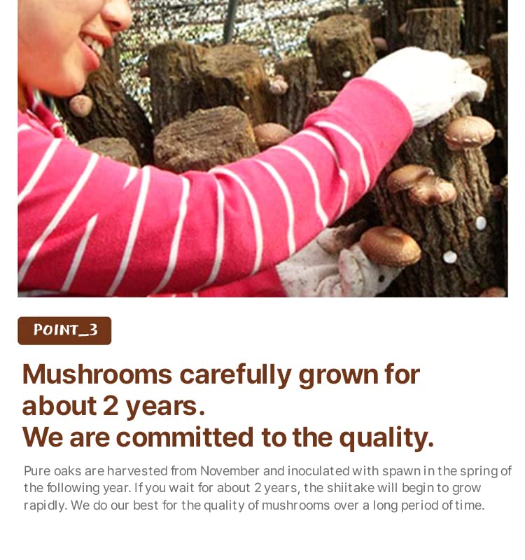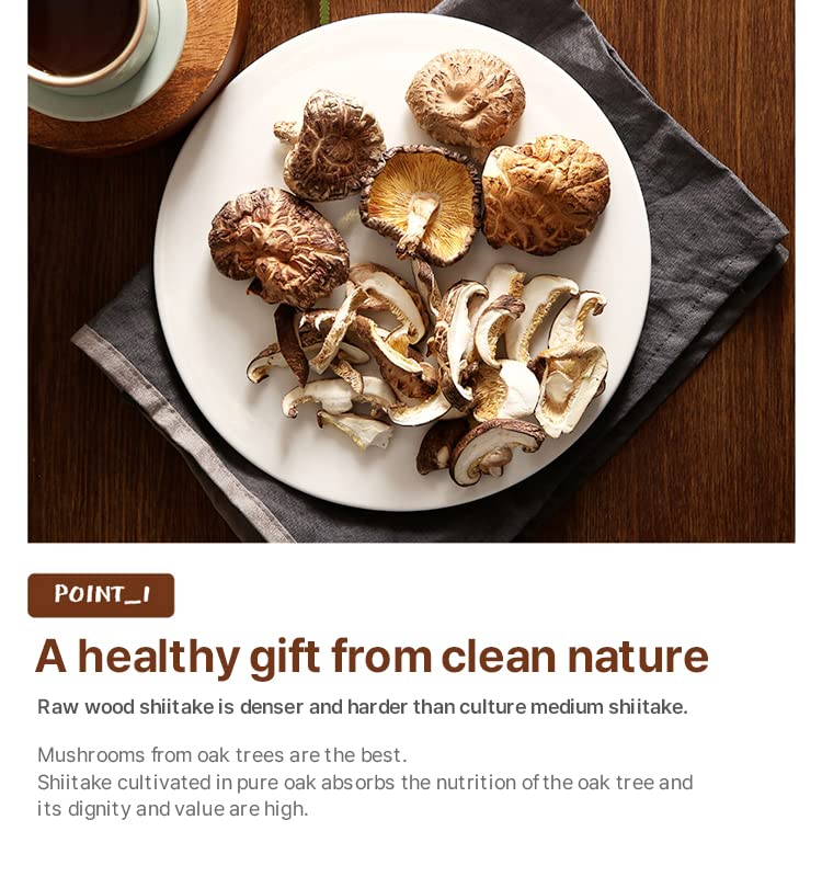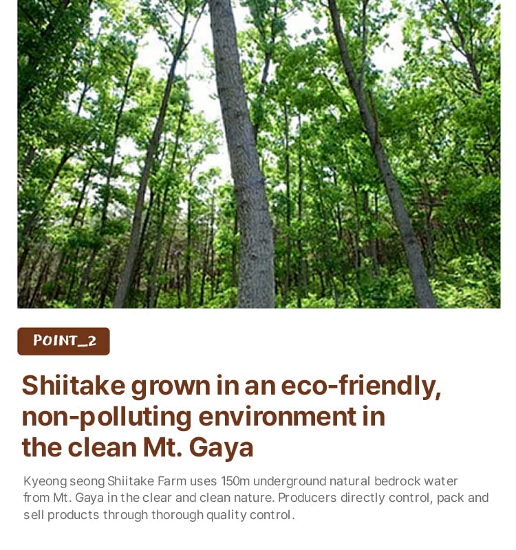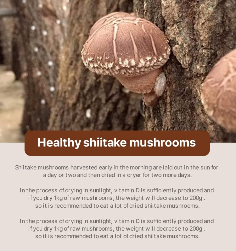 POINT02. Within the means of drying in daylight, vitmain D is sufficiently produced. Mushrooms are grown in an eco-friendly, non-polluting envirionmnet in clea mountain and thoroughly grown for about 2 years.