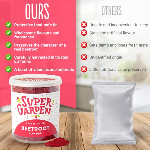 AT SUPER GARDEN, our freeze dried beetroot powder is made with a cautious freeze-drying course of that skips the liquid stage and goes straight from ice to vapor. Not solely it ensures that the powder has no taste misplaced, it preserves the vitamins and fragrances intact!