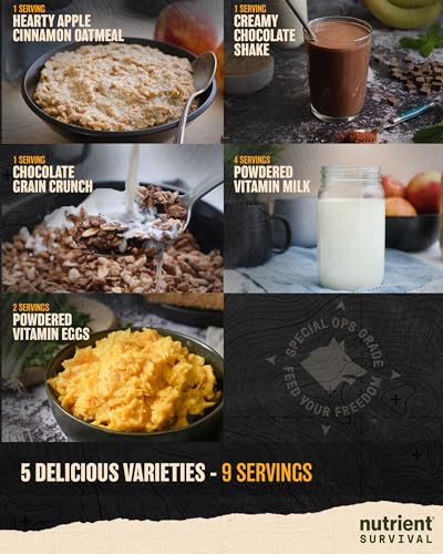 SPECIAL OPS GRADE NUTRITION: This emergency meals breakfast necessities sampler pack consists of Hearty Apple Cinnamon Oatmeal, Creamy Chocolate Shake, Chocolate Grain Crunch, Powdered Vitamin Egg Mix = 6 eggs & Powdered Vitamin Milk = 4 glasses of milk