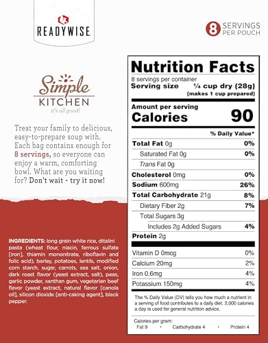 Household Favourite: Get pleasure from hearty, natural soup with ReadyWise Easy Kitchen Vegetable Beef Flavored Soup Combine. Good for household gatherings!