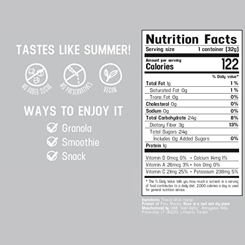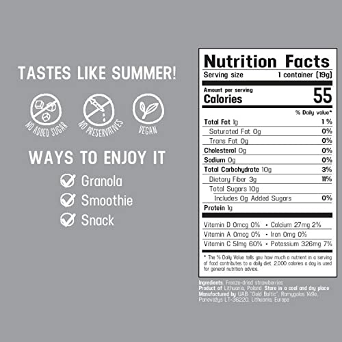 TASTY ADDITION of freeze-dried fruits on porridge, yogurt and ice cream, or use it to taste and beautify your desserts, smoothies and smoothie bowls, protein shakes and coctails. Goes nice with different dried combined fruit. Nice go-to snack at work, college, touring, tenting, and even flying to house!